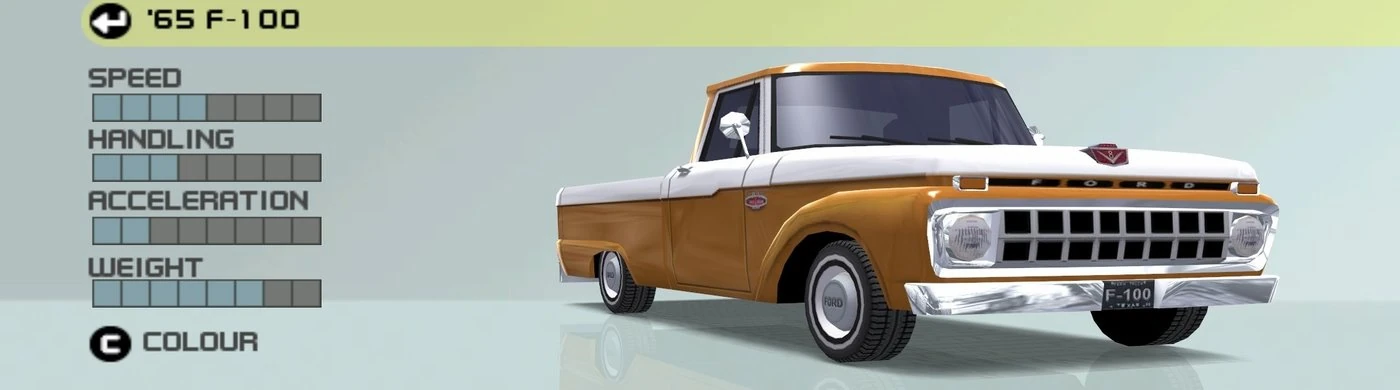 The F-100 has an average top speed, but also has poor acceleration. To add on, it has below average handling with a tendency for the rear wheels to lose grip and start sliding. Overall, it is fairly competent on off-road tracks due to its weight making it easy to control on bumpy surfaces. However, it may struggle on road-based tracks. It performs slightly similar to the 1948 Ford F1 and 1956 Ford F-100 as well.
