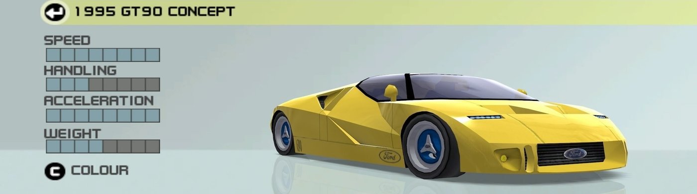 The 1995 Ford GT90 Concept is an unlockable vehicle in the Performance class, which can be unlocked in Ford Competition mode in the PC, PS2 and Xbox versions. In the DS and GBA versions, it can be unlocked in Ford Competition mode instead. The car is a 2-door, mid-engine sports cars that was built as a concept car, serving as the spiritual successor to the original Ford GT40. It also showcased Ford's brand new design language called Ford's New Edge design during that period, which would be later seen in other Ford production cars sometime between the late 1990s and early 2000s.