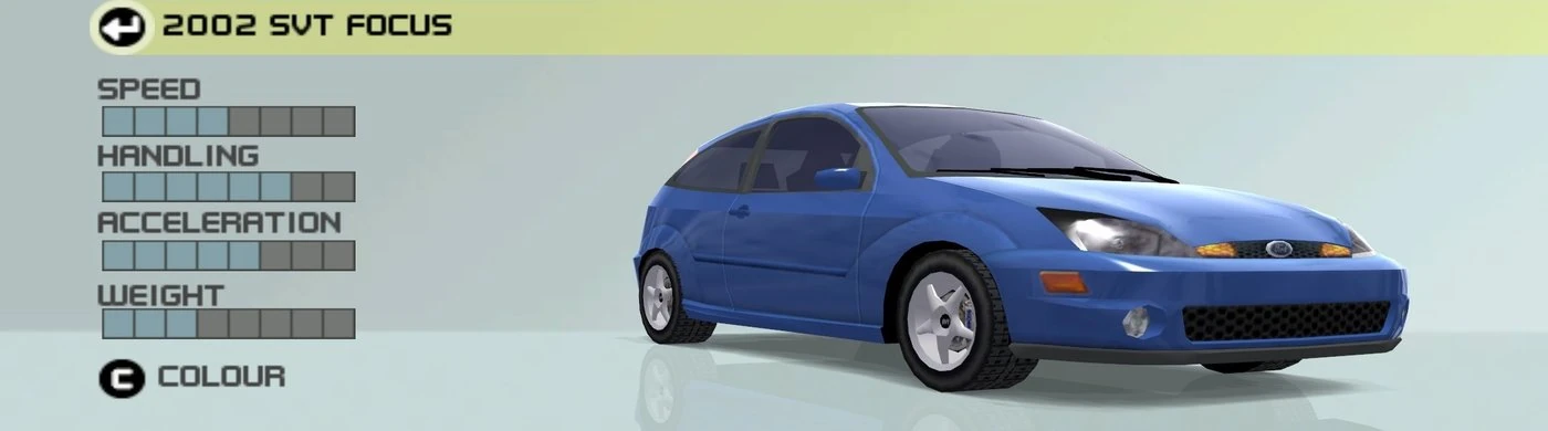 The 2002 Ford SVT Focus is an unlockable vehicle in the Modern class, which can be unlocked in Ford Challenge mode. The car is a performance version of the first generation 3-door Ford Focus hatchback manufactured by Ford Europe, with tuning done by Ford SVT.